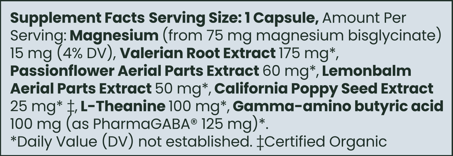 This bottle is a beautiful blend of the world's natural powerhouses for moving the body into a restful state. Below are our evidence-backed nutrients that fully help us slow down, relax, and fully rest.