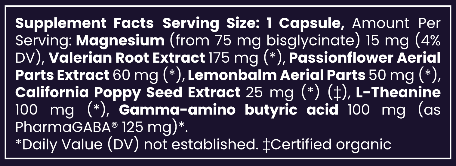 This bottle is a beautiful blend of the world's natural powerhouses for moving the body into a restful state. Below are our evidence-backed nutrients that fully help us slow down, relax, and fully rest.